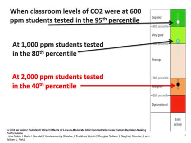 Here's what undermines that investment: Every time you breathe out, our exhaled air contains 100 times more carbon dioxide (CO2) than the air you inhaled. In poorly ventilated classrooms, CO2 rises with each breath out. As CO2 levels climb above 600 parts per million, cognitive function measurably declines—for both students and teachers. The higher the CO2, the greater the impact on concentration, memory, and learning.